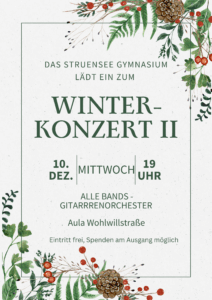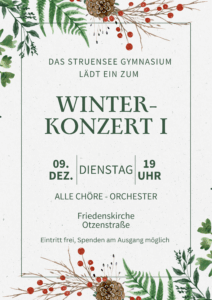 In den letzten Wochen wurde kräftig gesungen, geübt, gespielt und geprobt. Nun können die Ergebnisse dieser Anstrengungen bei den beiden Winterkonzerten bewundert werden. Die Ensembles des Struensee Gymnasiums freuen sich auf zahlreiche Konzertbesucher. Also die beiden Termin vormerken und vorbeikommen!