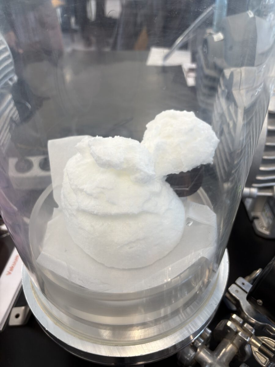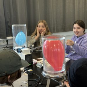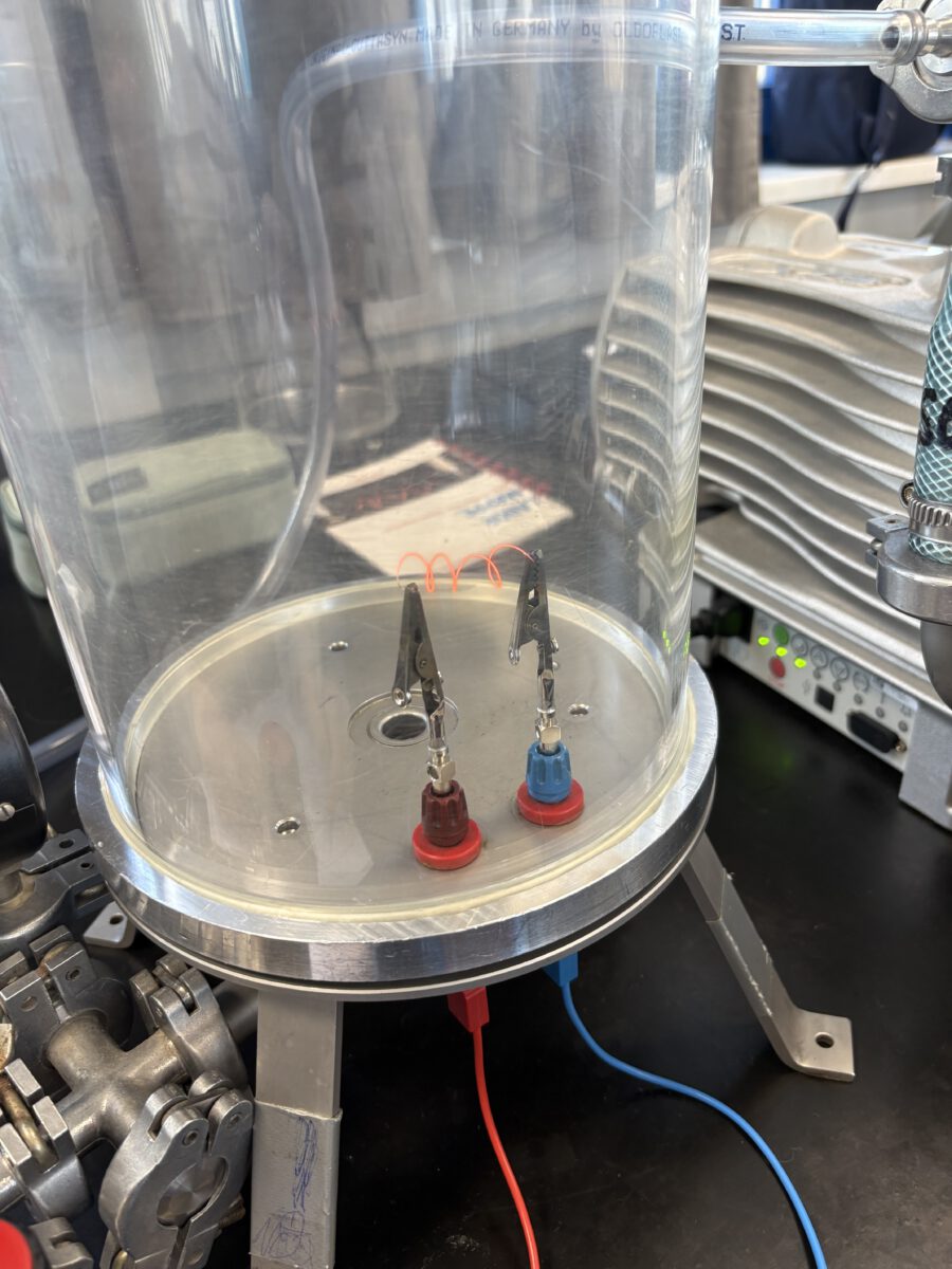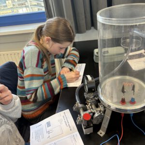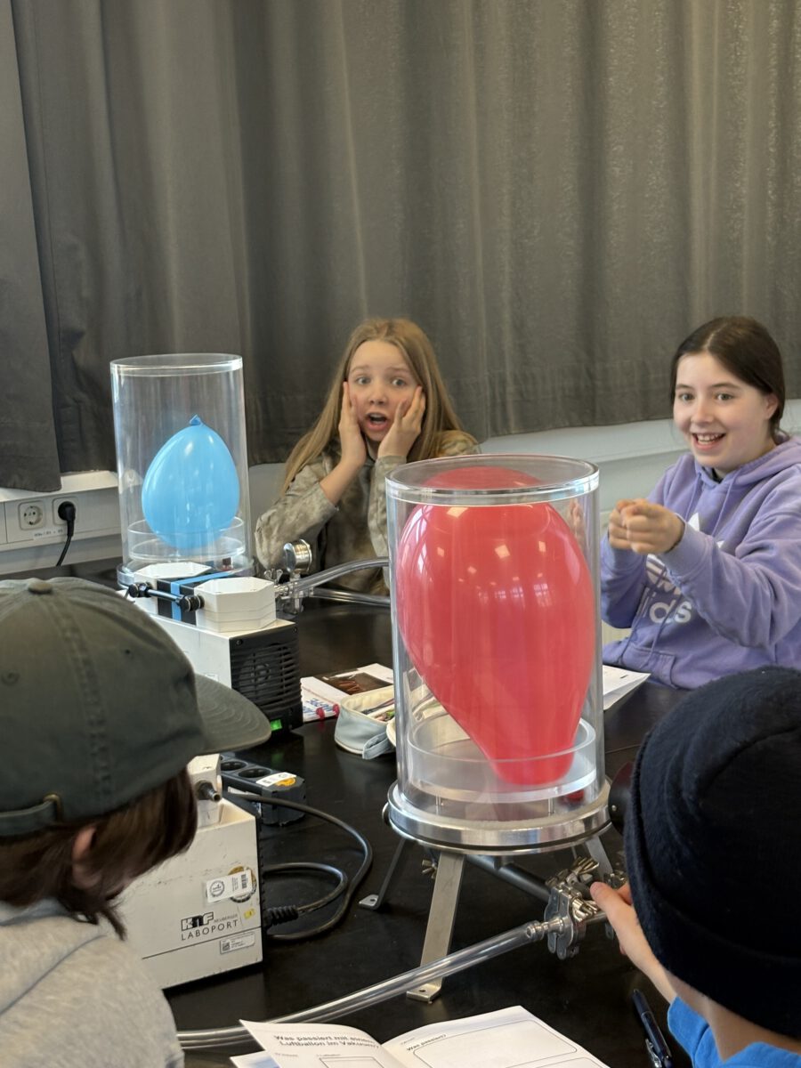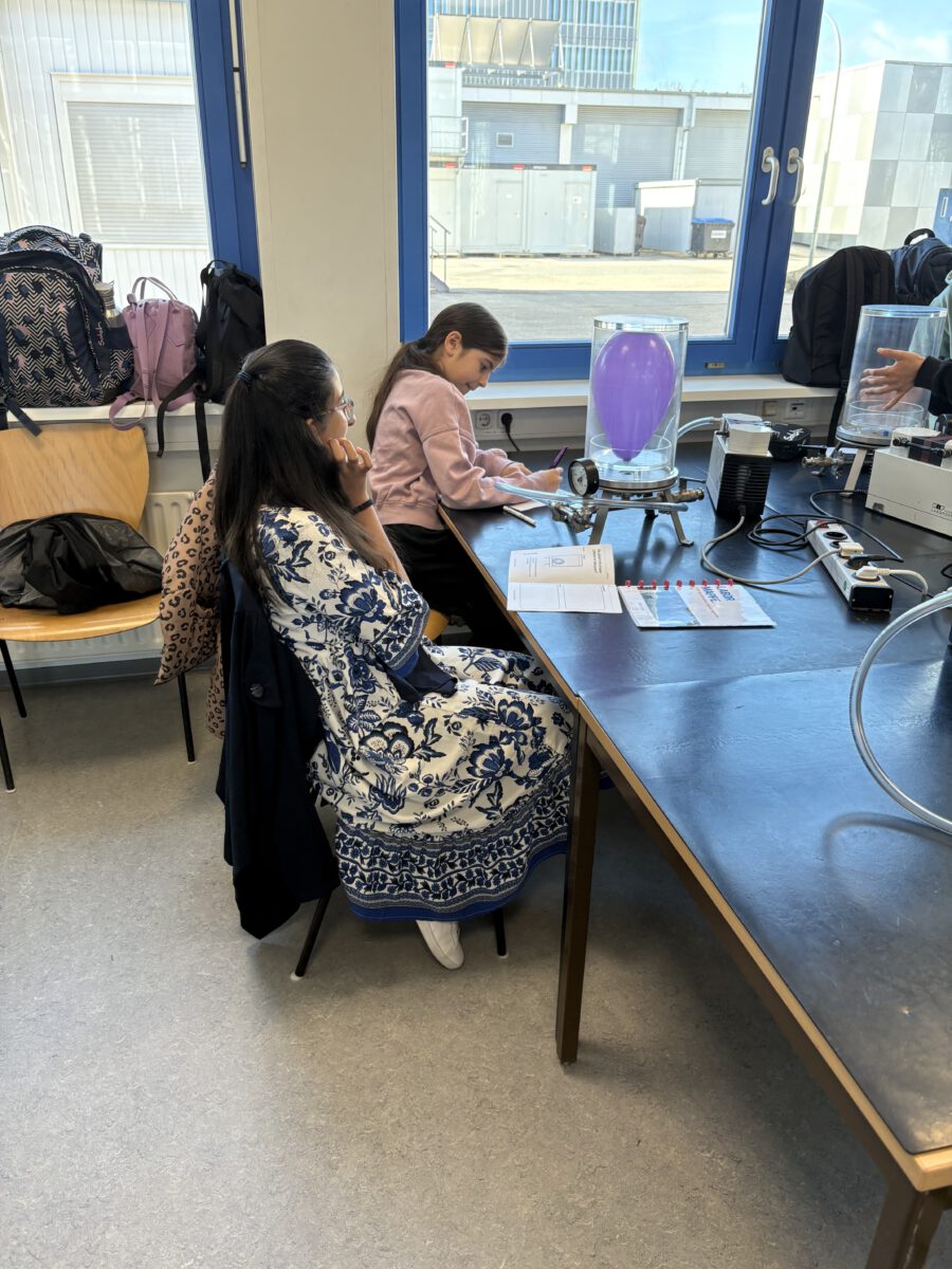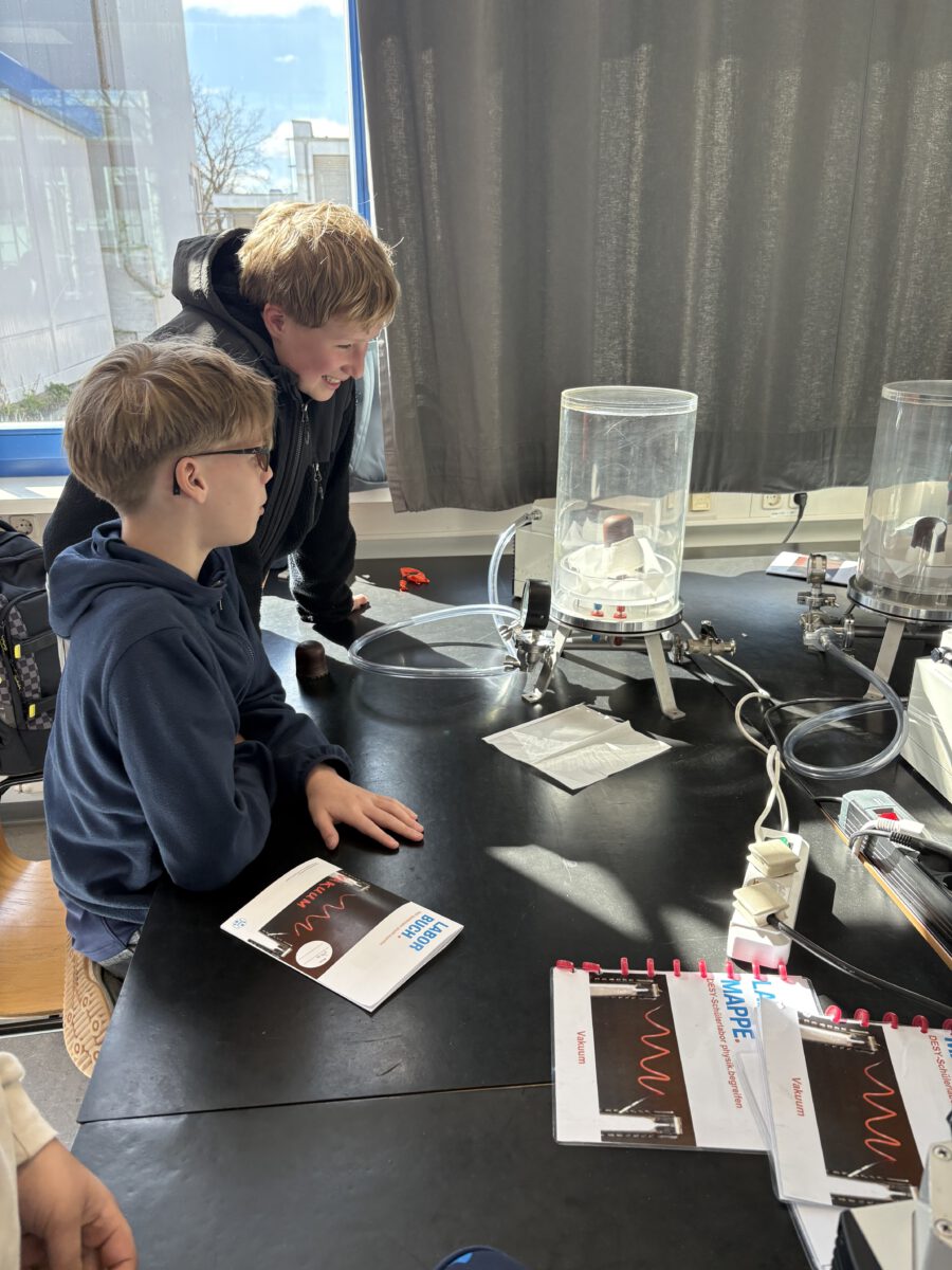 Danach wurden wir selbst zu Physikerinnen und Physikern, indem wir viele Experimente im Vakuum durchführten. Jeder und jede von uns bekam dazu ein Laborbuch. Jede Kleingruppe hatte einen Physikstudenten als Betreuer an der Seite, der uns viel erklärte und unsere Fragen beantwortete. Zwischendurch konnten wir uns in einer Frühstückspause stärken. Am Ende gab es noch ein sehr leckeres Abschlussexperiment mit einem SCHOKOKUSS.