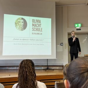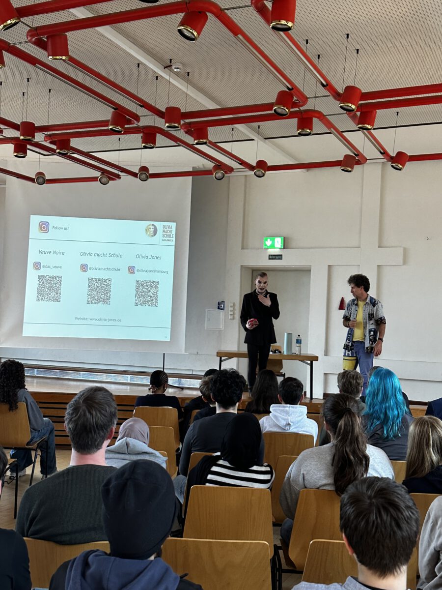 Am Dienstag, den 07.10.2025, durften wir bereits zum zweiten Mal Veuve Noire begrüßen. Veuve Noire ist Mitglied der „Olivia Jones Familie“ und Botschafterin des bundesweiten Projektes „Olivia macht Schule“, welches sich für Empowerment und ein besseres Miteinander einsetzt.