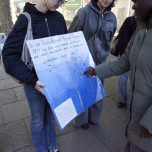 Im Rahmen eines vierwöchigen Workshops entstand in Zusammenarbeit mit der Künstlerin Vera Drebusch ein künstlerisch-performativer Rundgang zur Ausstellung „Blutiger Boden. Die Tatorte des NSU“. Thematisch geht es um Rechtsextremismus, die Tat in der Schützenstraße im Jahr 2001 sowie um die unmittelbare Nachbarschaft des Tatorts.