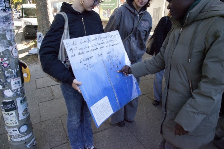Vera Drebusch entwickelt in enger Kooperation mit dem Projektteam der Ausstellung sowie den Schüler:innen des Struensee-Gymnasiums eine Route durch Altona. Dabei begleitet sie deren Performances und installative Interventionen an ausgewählten Orten. Arbeitsorte sind sowohl das Struensee-Gymnasium als auch der öffentliche Raum im Bezirk Altona.