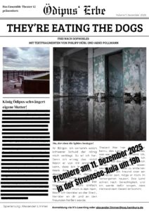 Am Donnerstag, den 11. Dezember, feiert der Theaterkurs des 12. Jahrgangs um 19 Uhr in der Struensee-Aula Premiere mit seinem kurzweiligen Stück „Ödipus’ Erbe – They’re Eating The Dogs“. Es geht um Fake News, Populismus und einen König, dem vorgeworfen wird, seine eigene Mutter geheiratet zu haben. Wir würden uns sehr über ein großes Publikum freuen! Kostenlose Tickets kann man sich sichern unter itslearning oder über alexander.limmer@ssg.hamburg.de.