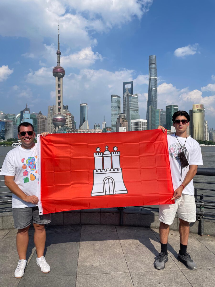 … senden uns Tayfun (11. Jg.) und Herr Wilming-Jarkulisch. Sie befinden sich gerade stolze 8552 Kilometer von uns entfernt und nehmen mit einer kleinen Schüler-Delegation aus Hamburg an dem Treffen aller Partnerstädte in Shanghai teil. Das International Sister Cities Youth Camp findet jedes Jahr in Shanghai statt und ermöglicht den Teilnehmern spannende Einblicke in die chinesische Kultur und das Leben in der 25 Millionen Metropole. Dieses Jahr hatte Tayfun das Glück, neben vier anderen Schülern Hamburger Schulen ausgelost zu werden und zwei Wochen dort zu verbringen. Wir sind gespannt auf seine Eindrücke.